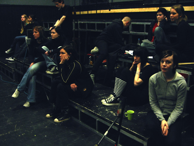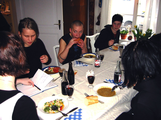 Soundcheck. Längst bort sitter Linda och Malin från Gävle som hade fanzinet My Art is better than yr art, följt av medlemmarna i Exit Iris (Gbg) och Dyke Hard (Sthlm). Närmast sitter Malin och jag.