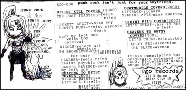 ”In 1997 i compiled the “Punk Rock Isn’t Just For Your Boyfriend” compilation for my DIY cassette label Ego Records. It took about 3 years & was released in 2000 & then updated with new tracks in 2002! This comp. contains Bikini Kill,Heavens To Betsy & Bratmobile covers by The Post Toasties,Slobber,Pretty Fury,Lickety Split,Liftback (members of The Sarcastic Bitch) Let’s Cheat,Lo-fi Bri ,the Plath & MORE!!!