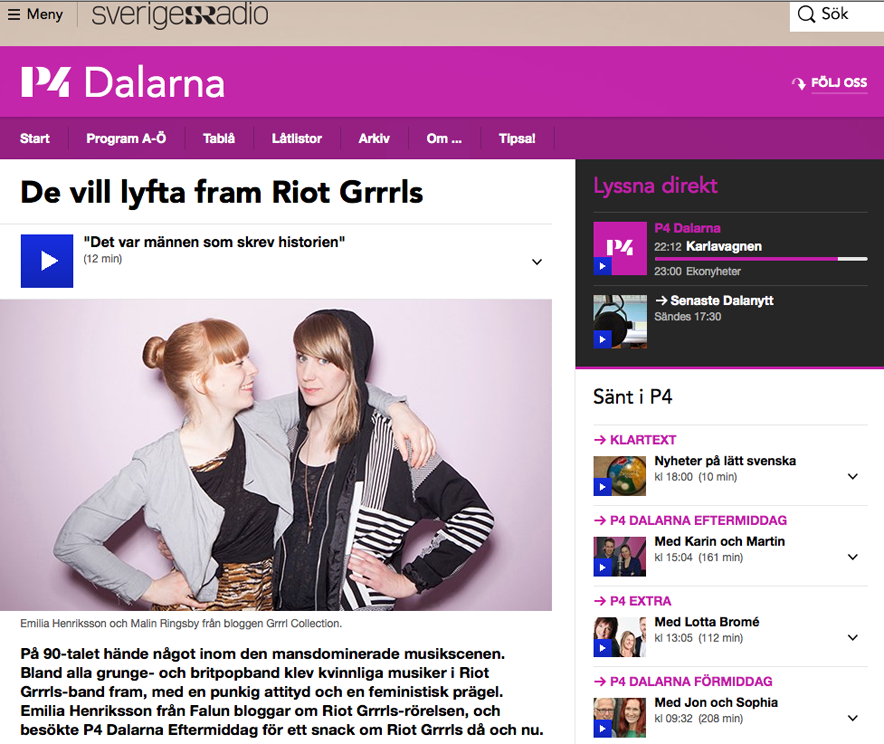 “På 90-talet hände något inom den mansdominerade musikscenen. Bland alla grunge- och britpopband klev kvinnliga musiker i Riot Grrrls-band fram, med en punkig attityd och en feministisk prägel. Emilia Henriksson från Falun bloggar om Riot Grrrls-rörelsen, och besökte P4 Dalarna Eftermiddag för ett snack om Riot Grrrls då och nu.”