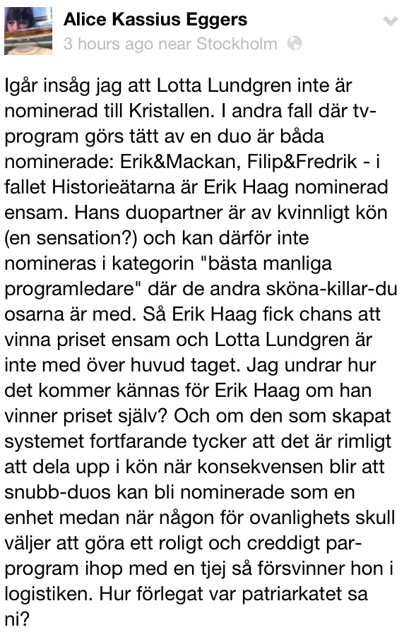 Författaren och jornalisten Alice Kassius Eggers började dagen med en viktig fråga på Facobook rörande Kristallen. Hur tänker ni kring detta? Kommentera gärna!