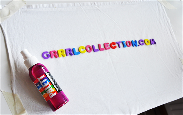 Mitt tips är alltså: självhäftande bokstäver eller mönster. Se till att trycka till dem ordentligt så att färgen inte läcker. Spraya, torka, fixera med strykjärn, klart!